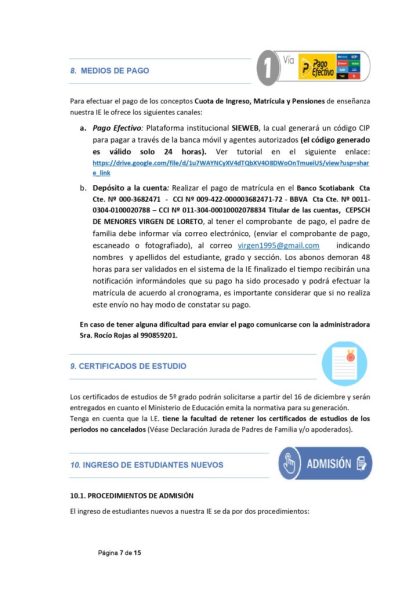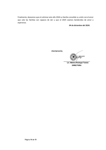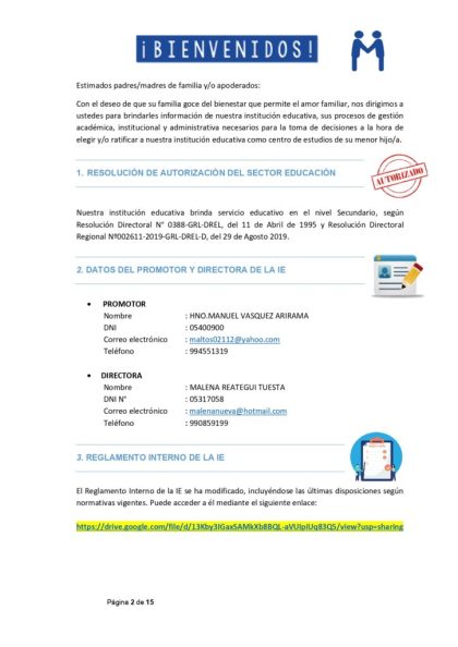 Con el deseo de que su familia goce del bienestar que permite el amor familiar, nos dirigimos a ustedes para brindarles información de nuestra institución educativa, sus procesos de gestión académica, institucional y administrativa necesarios para la toma de decisiones a la hora de elegir y/o ratificar a nuestra institución educativa como centro de estudios de su menor hijo/a.